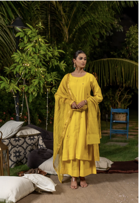 Feather-light Chanderi silk in a morning-sun yellow forms the base of this handcrafted kurta. Mughal-inspired butta and jaal motifs, paired with a cotton-silk dupatta with golden stripes, add subtle opulence.