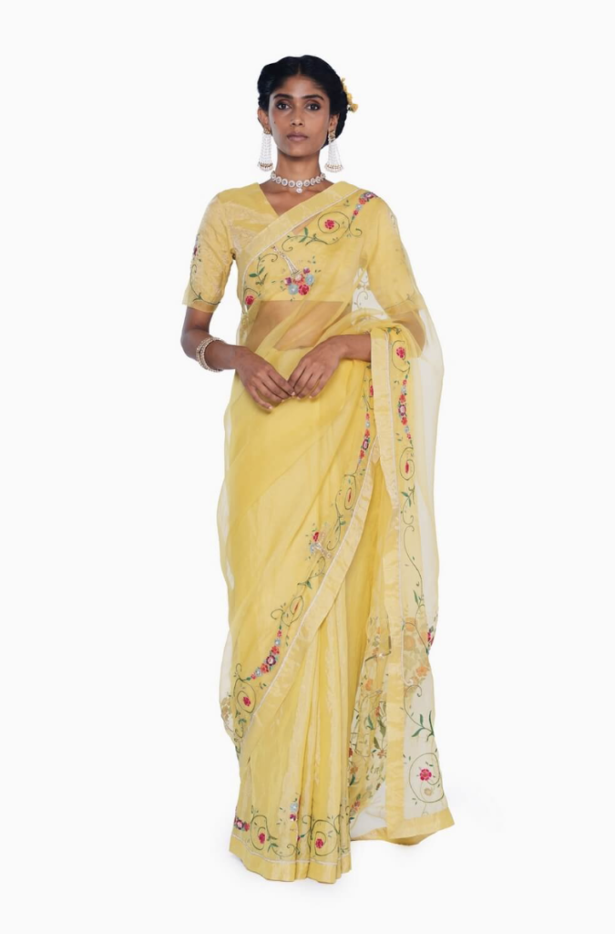 Anavila’s Sarmast sari is a masterclass in textile storytelling. Inspired by baroque arches and ceilings, the ivory-yellow canvas is adorned with colourful hand-appliqué bouquets, scalloped detailing, intricate beadwork, and delicate hand embroidery, culminating in an architectural pallu. Ethereal yet intellectual in spirit, this sari aligns beautifully with Vasant Panchami’s essence quiet reflection, learning, and the celebration of craft rooted in culture.