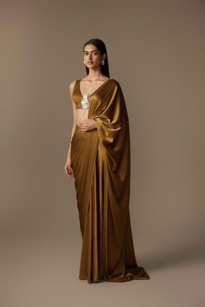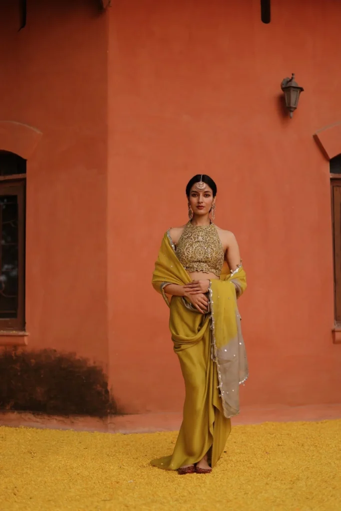 Styled with a stainless-steel CNC laser-cut ‘Crochet Wave’ quilted bralette and an open-palla drape, this saree breaks away from traditional norms. Ideal for fashion-forward celebrators, it brings a bold, modern lens to Vasant Panchami dressing.