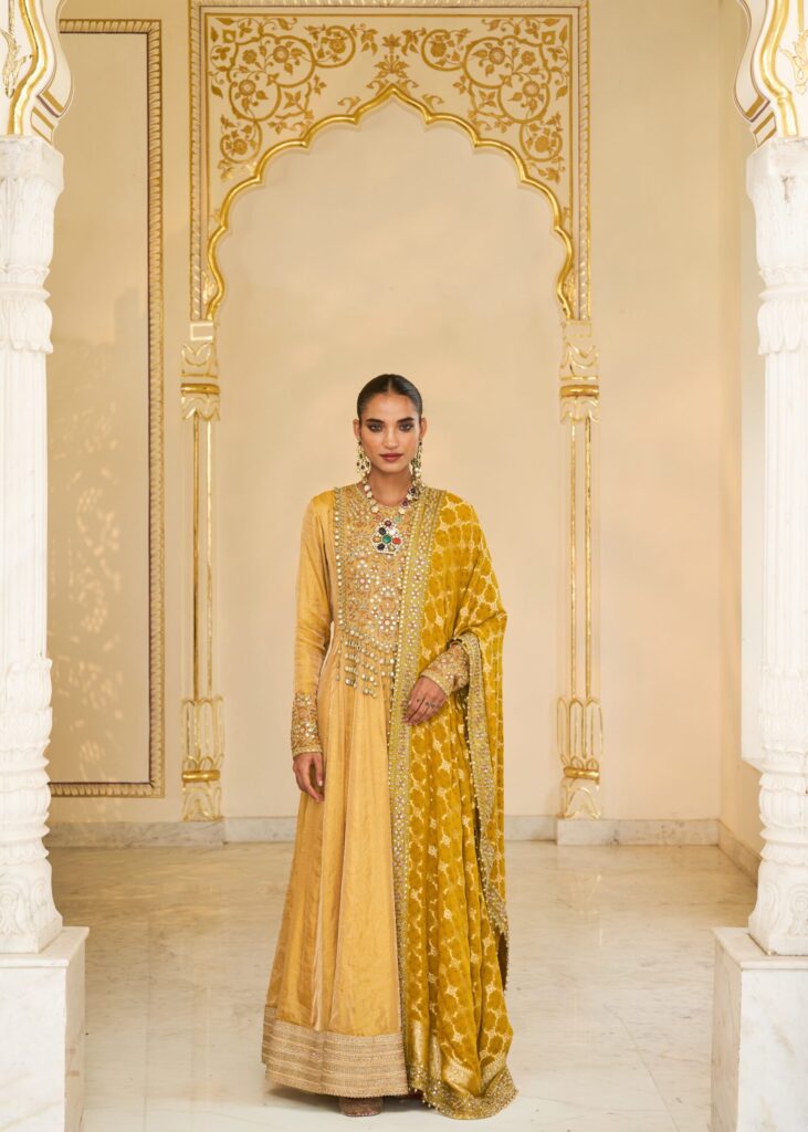 Crafted in luminous yellow tissue, this anarkali features a beige-gold yoke embellished with mirror work, cutdana, and multithread embroidery. The mustard bandhani dupatta with pearl detailing adds festive richness. Ideal for Vasant Panchami pujas, the ensemble embodies abundance, joy, and ceremonial grace.