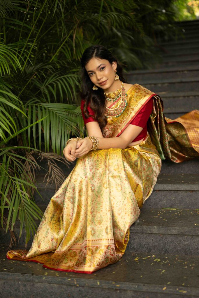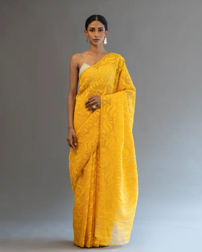Inspired by ripened fields and festive abundance, this golden-yellow saree features intricate motifs that radiate warmth and auspiciousness.