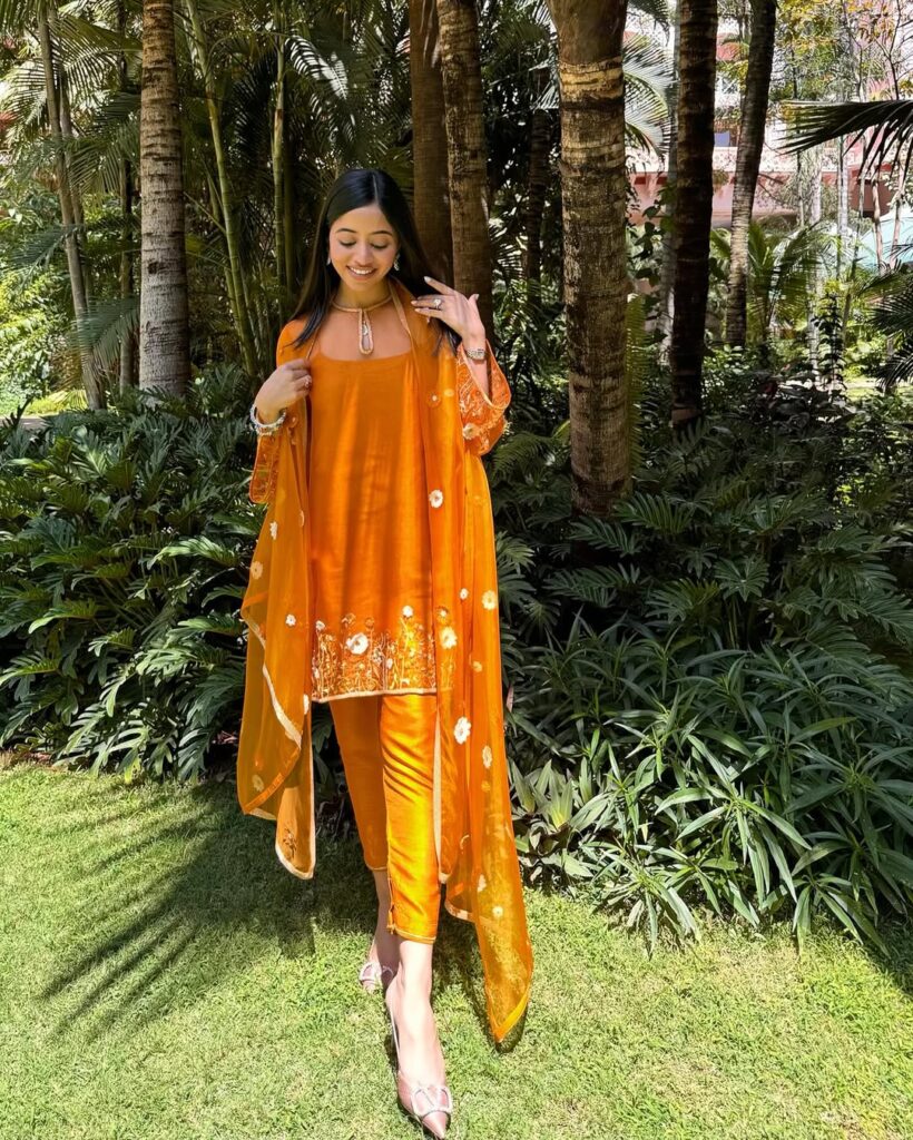 This mango-mustard festive suit features a silk-organza short kurti, raw-silk pants, and a 3D floral organza dupatta finished with fine embroidery.