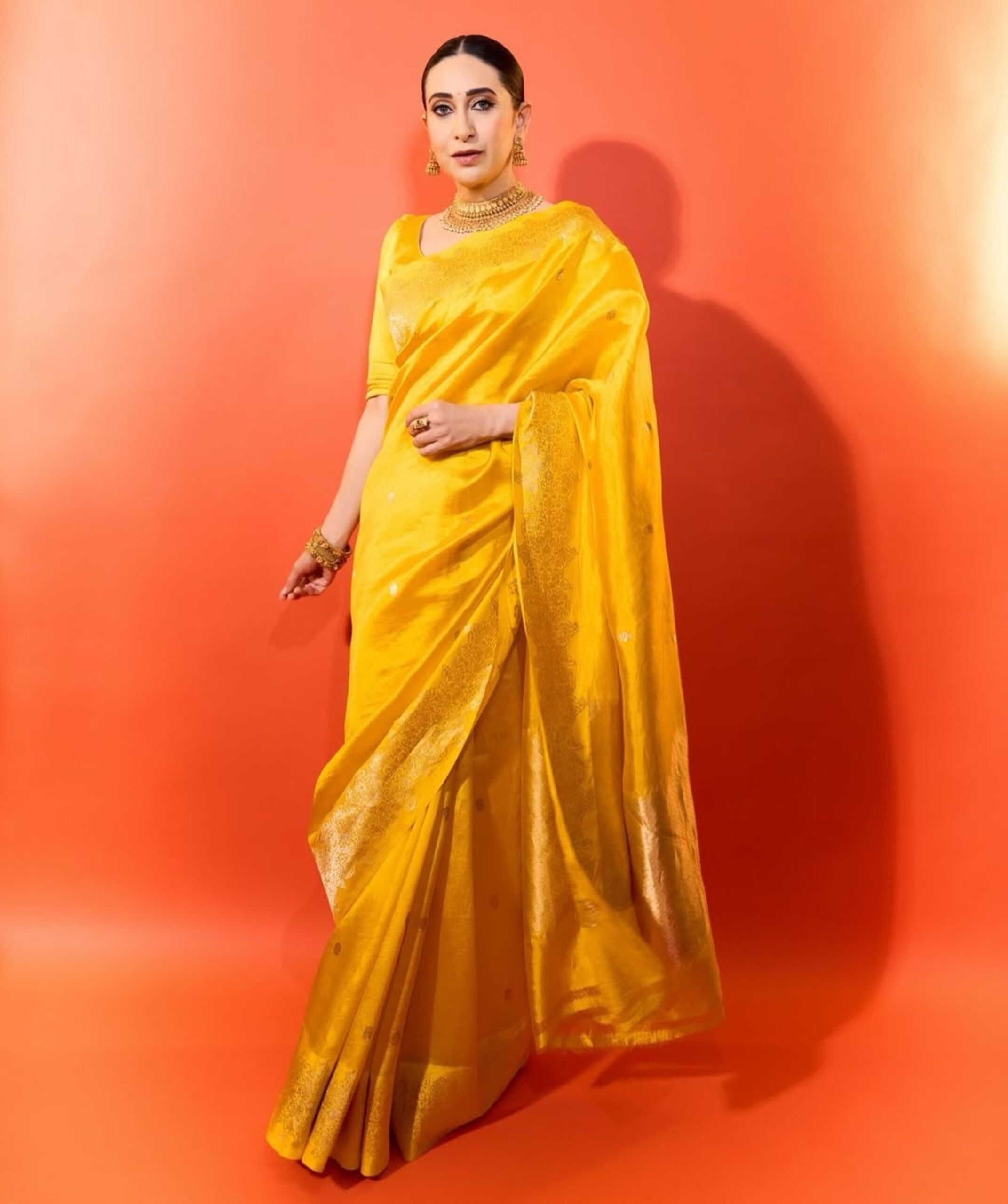 Karisma embraces festive charm in a bright yellow silk saree from Shanti Banaras, proving that classic hues and rich weaves never go out of style.