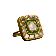 At its heart lies a striking uncut stone, surrounded by a halo of white polki and green enamel accents, all finished in an antique gold silhouette. Designed to make a statement at festive gatherings.