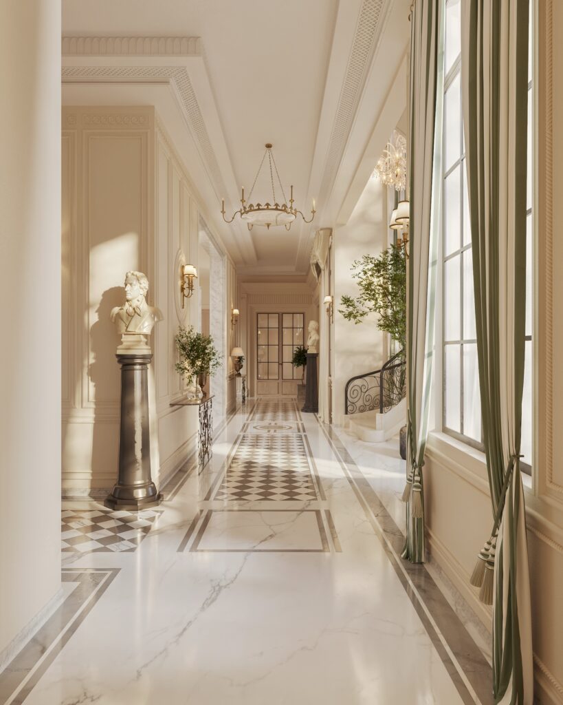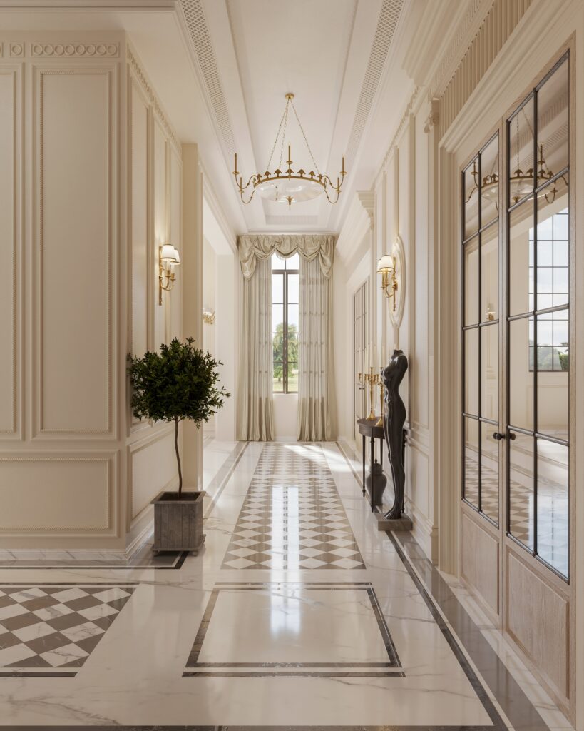 Ceilings aren’t just overhead planes; they are sculptural features, layered with coffered or recessed detailing that draw the gaze upward and create a feeling of height and lightness. Large windows allow daylight to cascade through the space, casting shadows that shift through the day and adding depth to the interiors.