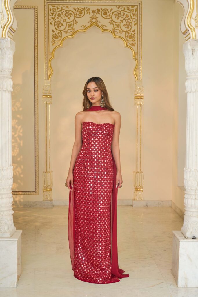 Bold, glamorous, and unapologetically sexy, Arpita Mehta’s red hand-embroidered bodycon dress is made for Valentine’s nights that demand attention. The intricate embroidery adds texture and richness, while the body-hugging silhouette celebrates confidence and femininity. This is the ultimate power-red dress for making an unforgettable entrance.