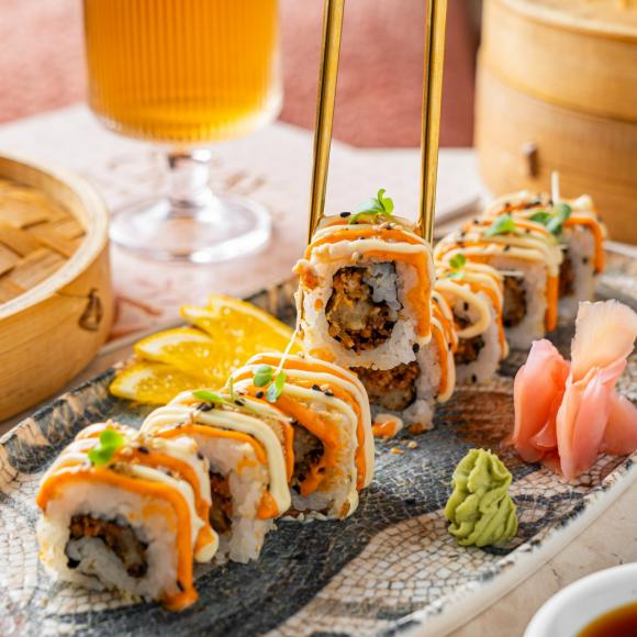 Mirage in the heart of Santacruz, Mumbai. Dive into exquisite sushi and maki selections such as the Gold Rush Maki with vegetable tempura, avocado, yuzu, and truffle mayo. Don’t miss the vibrant Salmon Tiradito featuring salmon, yuzu, mustard, avocado, black olive dust, and garlic salsa this Sushi Day.