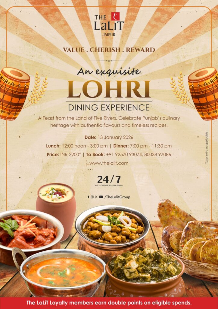 The LaLiT Jaipur marks Lohri with an indulgent Punjabi buffet at its all-day dining restaurant, 24/7. Drawing inspiration from Malwa, Majha and Doaba, the spread celebrates hearty winter flavours think smoky tikkas, slow-cooked dals, robust curries and an extensive dessert counter featuring pinni, ghewar cheesecake and jalebi panna cotta. Lassi and chaas keep things refreshingly traditional.