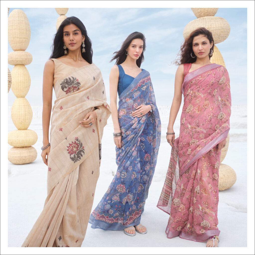 Chintz Collective draws from the timeless charm of Indian craftsmanship, inspired by the heritage of Sanganer woodblock prints. Delicate vintage florals unfold on light, airy bases, paired with soft, feminine drapes that feel effortlessly elegant. Chambray City follows with a more everyday pattern, crafted in lightweight, yarn-dyed cotton chambray known for its breathable comfort, gentle texture, and designed for ease. Urban Rang brings a confident shift in the mood, celebrating bold, solid brights that feel energetic, expressive, and unmistakably modern. Indigo Hues slows things down with classic indigo tones set to redefine this staple in Indian fashion while being refreshingly in sync with the season. Studio Ajrak reimagines tradition through a modern lens, featuring tile-inspired prints, heritage motifs, thoughtful placements, and a new colour palette that feels current yet rooted and lastly Summer Looms offers a curated line of summer sarees, in lightweight, breathable fabric, designed for comfort, perfectly suited for summer.
