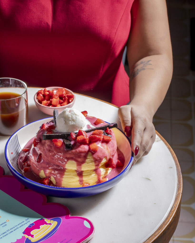 Soft, airy, and impossible not to fall for, this signature jiggly pancake is layered with luscious strawberry sauce and fresh strawberry pieces, then crowned with a scoop of creamy ice cream. Every jiggle promises sweetness, comfort, and just the right amount of drama perfect for sharing.