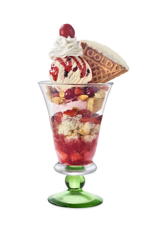 As the name suggests, this sundae is a celebration of all things strawberry. Featuring scoops of strawberry and vanilla ice cream, layered with strawberry sauces and topped with wafers, whipped cream, and occasional chocolate-coated waffle elements, this dessert is playful, nostalgic, and perfect for sharing.