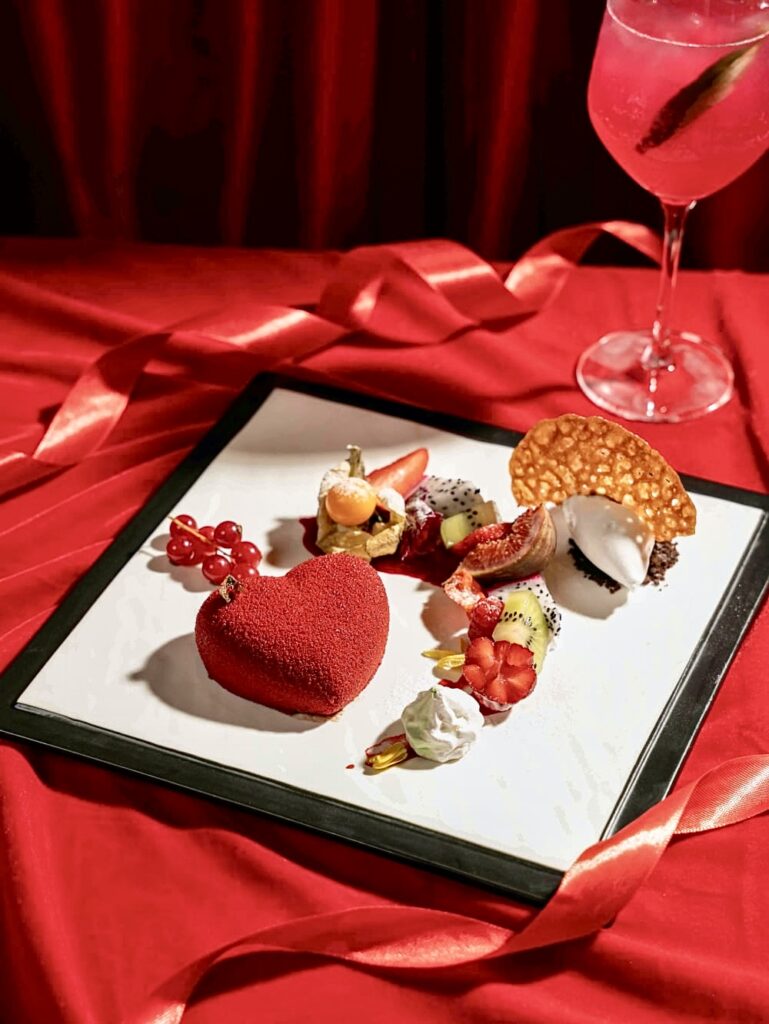 Less a dessert and more an edible piece of art. This radiant strawberry mousse hides a luscious compote heart, wrapped in a glossy glaze that instantly draws the eye. Served with rose gelato, raspberry caviar, and a delicate tuile, it’s a beautiful play of floral, fruity, and refined flavours ideal for special Valentine moments.