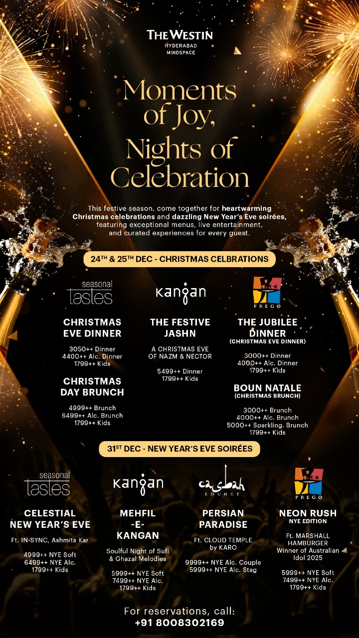 The Westin Hyderabad Mindspace transforms into a celebration hub with multiple themed New Year’s Eve experiences. Seasonal Tastes hosts a lively DJ-led countdown paired with an expansive buffet and celebratory beverages, offering guests the flexibility to choose a mood that suits their celebration style.