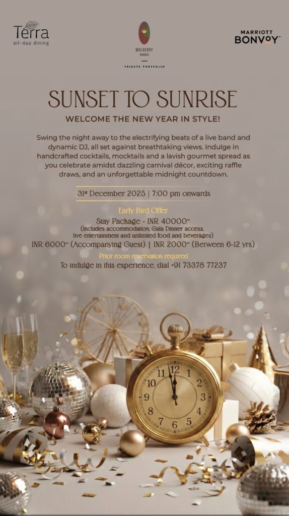 Mulberry Shades Bengaluru Nandi Hills invites guests for an unforgettable countdown and ring in the New Year in style at the foot of Nandi Hills. This year, come celebrate with us and indulge in a curated experience with a live band, dynamic DJ, and a gourmet spread that will tingle your tastebuds!
