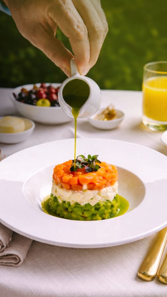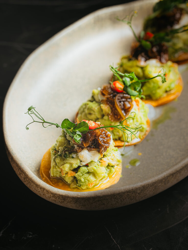 A contemporary tricolour-inspired plate featuring crisp avocado textures complemented by balsamic onion chutney, Aleppo chilli heat, dill tartare and basil oil. Bold, fresh and modern, it’s a flavour-packed expression of creativity and colour.