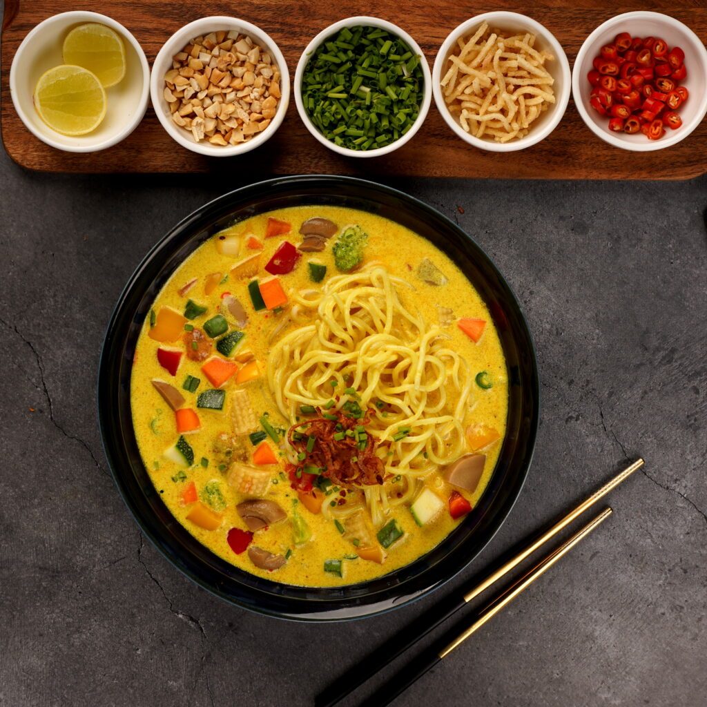 - Serve hot in a bowl topped with the condiment set – burnt garlic, fried onions, fried noodles, chopped spring onions, coriander leaves, fresh red chilli, crushed peanuts, and lemon wedges.